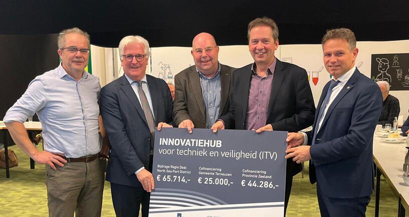 Vandaag overhandigden gedeputeerde Jo-Annes de Bat en burgemeester van Terneuzen Erik van Merrienboer een symbolische cheque voor de realisatie van de Innovatiehub voor Techniek en Veiligheid (ITV) bij de CO3 Campus in Terneuzen. Het project ontvangt de eerste subsidie vanuit de Regio Deal North Sea Port District. Het gaat om een bedrag van € 65.714,-. Provincie Zeeland draagt € 44.286,- bij aan cofinanciering. Ook de gemeente Terneuzen draagt bij en geeft €25.000,- aan cofinanciering. Het ITV biedt een open werk- en innovatieruimte voor bedrijven, onderwijsinstellingen en overheidsinstanties.